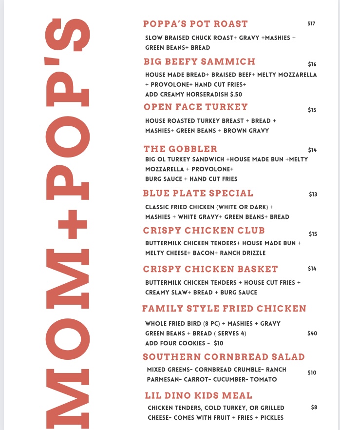 Mom Pop’s offers a straightforward, comforting menu that feels like a warm, familiar meal at home. The selection features hearty American classics designed to satisfy any appetite, whether you're stopping by for a casual lunch or a relaxed dinner. The menu leans into familiar flavors with a focus on fresh, homemade touches—think tender roast beef, crispy fried chicken, and generous sandwiches crafted from scratch.